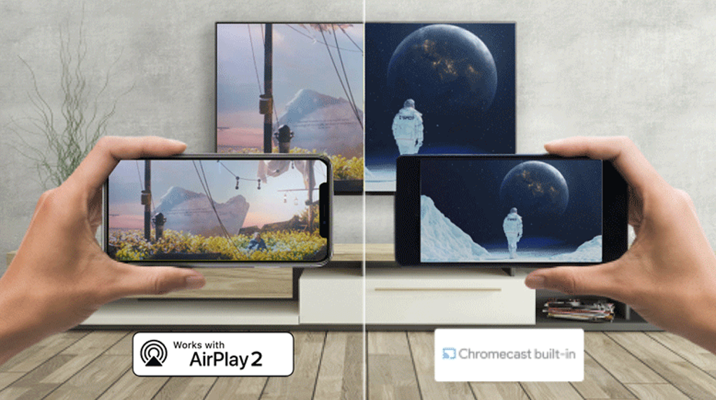 – Các tính năng Chromecast (phù hợp sử dụng cho điện thoại Android), AirPlay 2 (tương thích các dòng máy của Apple) hỗ trợ bạn chia sẻ hình ảnh với bạn bè trong phòng, phát chương trình giải trí, phim, tài liệu từ điện thoại lên màn hình lớn tivi để cùng mọi người trải nghiệm thuận tiện.